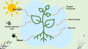Photosynthesis occurs in the leaves, which serve as the “food factory” for plants. Carbon dioxide enters the leaves through small openings known as stomata. Water molecules and the necessary minerals are transferred from the roots to the leaves via the stem. Chlorophyll enables the leaves to harness sunlight energy to produce food using carbon dioxide, water, and minerals; as a by-product oxygen will be released. The overall equation can be represented as follows: