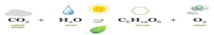 carbon dioxide + water —> glucose + oxygen + water