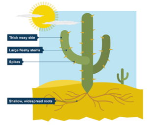 - Cacti, which inhabit arid environments, have leaves that are transformed into spines to minimize water loss through transpiration.